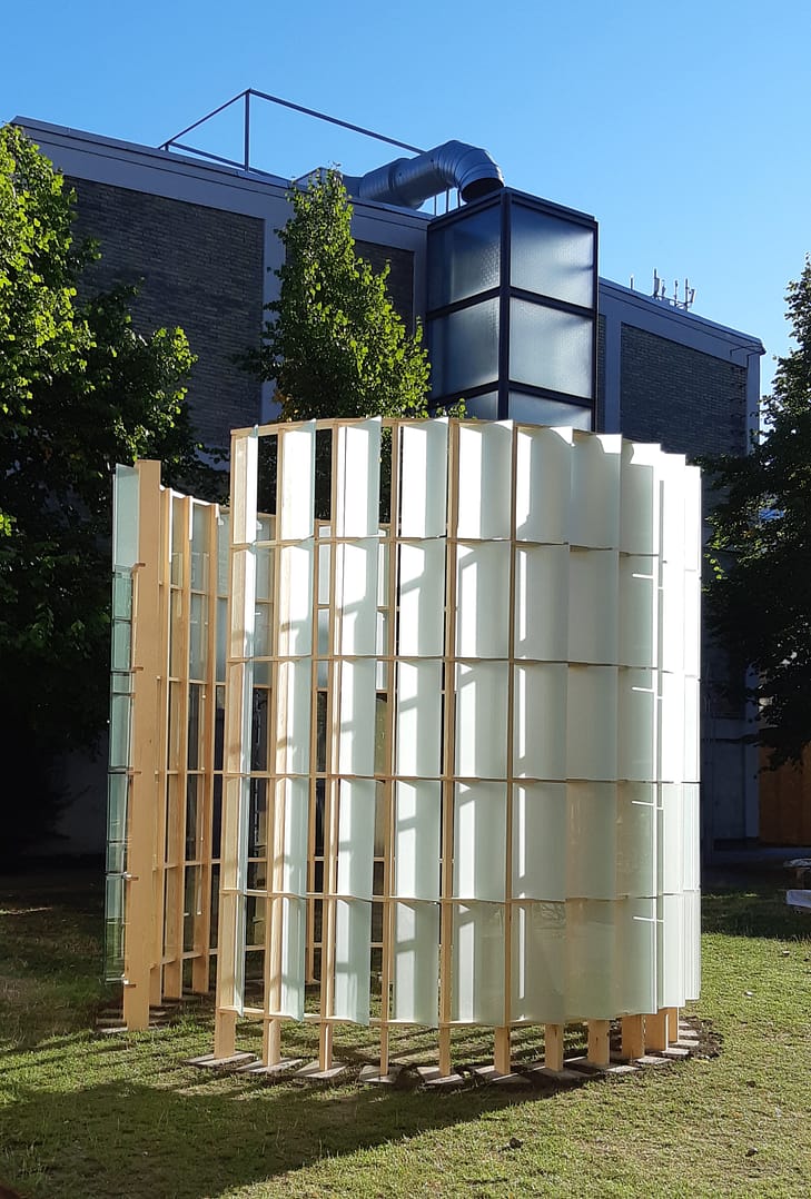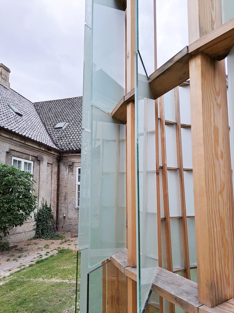 Trace Pavilion is a collaborative project between glass designer Maria Sparre-Petersen and architects Isak Worre Foged and Vasiliki Fragkia exploring how glass from used windows can be extracted and developed into articulated glass assemblies. We propose alternatives to the linear economy of producing new glass panes from virgin materials by exploring and developing artistic design methods to reuse and rearticulate existing window glass from a renovation of a building on the Royal Danish Academy campus in Holmen Copenhagen, that was headed for the landfill.